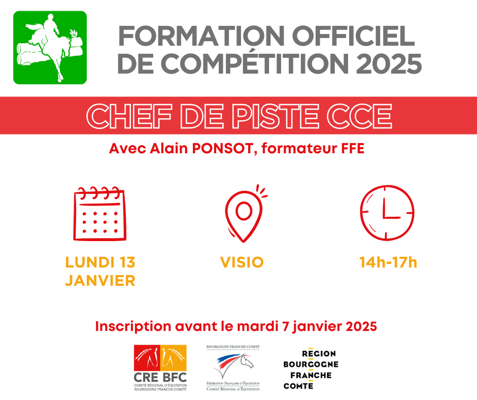Nous vous proposons une formation chef de piste CCE en visio le lundi 13 janvier de 14h à 17h avec Alain PONSOT, formateur FFE.