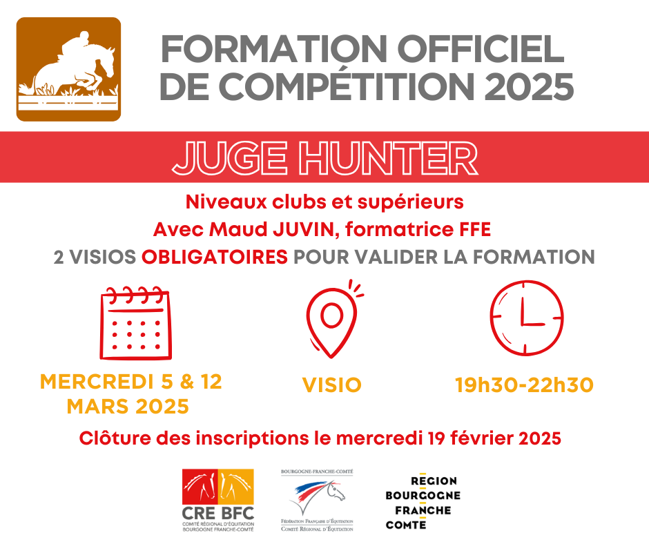 Nous vous proposons une formation visio juge hunter (niveau club et supérieurs), réservée à nos officiels de compétition BFC à jour de leur licence (2025).